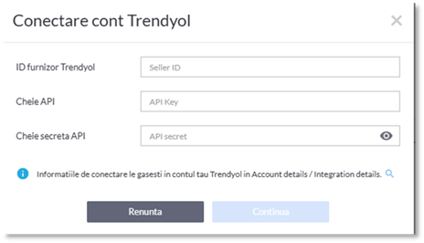 Aceste informatii sunt disponibile in contul Trendyol, in sectiunea Account details – Integration details. Imagini cu detalii despre modul in care gasesti aceste informatii in contul Trendyol, sunt afisate daca apesi pe „lupa”.