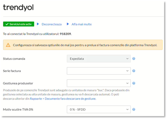 - Serie factura: un selector care permite alegerea seriei de facturi pe care se vor genera documente pentru comenzile din Trendyol;