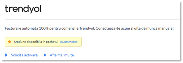In cazul in care modul eCommerce nu este activat pe cont, in sectiunea Trendyol esti informat ca integrarea este disponibila doar cu modulul eCommerce. Alaturi se mesaj sunt afisate optiunile: