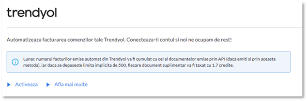 In cazul in care modul eCommerce este activat, se afiseaza informarea legata de numarul documentelor generate din Trendyol care se vor cumula cu cele emise prin API. Se afiseaza si optiunile: