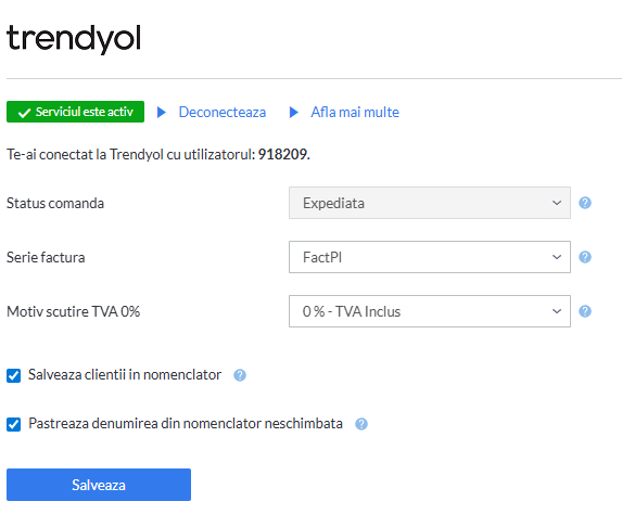 Cat timp serviciul este activ, se afiseaza si optiunea Deconecteaza care dezactiveaza integrarea. Daca ai deconectat integrarea, pentru reactivare trebuie sa reintroduci ID Trendyol si cheile API.