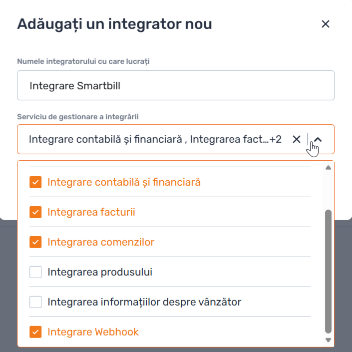 - Selectezi serviciile integrarii. Este vorba de 4 servicii din lista care se afiseaza: Integrarea contabila si financiara, Integrarea facturii, Integrarea comenzilor. Integrare Webhook.