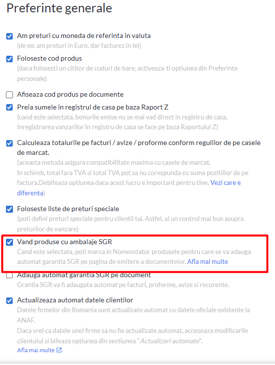 In Configurari > Preferinte generale se gaseste optiunea Vand produse cu ambalaje SGR. Daca este activata, poti asocia informatii legate de garantia SGR produselor inregistrate in aplicatie.