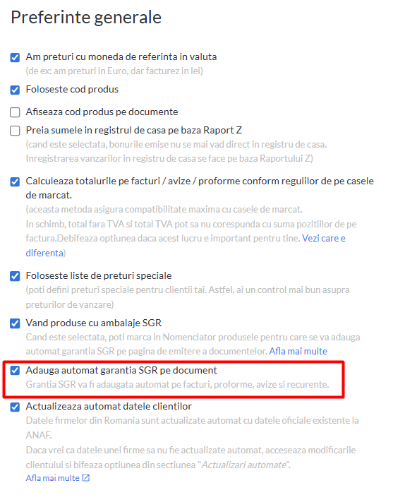 Pentru a automatiza acest lucru trebuie sa bifezi optiunea Adauga automat garantia SGR pe document aflata in Configurare > Preferinte generale.