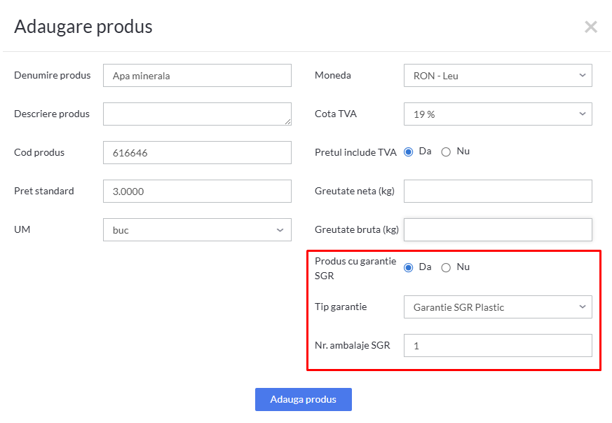 - Produs cu garantie SGR: daca bifezi, indici ca respectivul produs are asociat un ambalaj SGR;