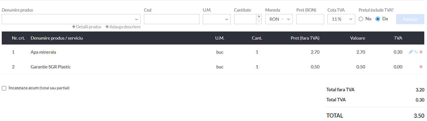 Ai optiunea de a adauga automat garantia SGR pe documentul de vanzare (factura, bon fiscal, proforma sau aviz), atunci cand un produs pe care l-ai marcat ca avand garantie SGR este introdus pe acesta.