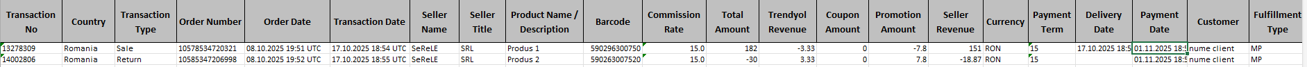 In imagine, se regaseste un model al borderoului Trendyol care poate fi importat. Capul de tabel a fost redimensionat si „colorat” doar pentru a evidentia informatia.