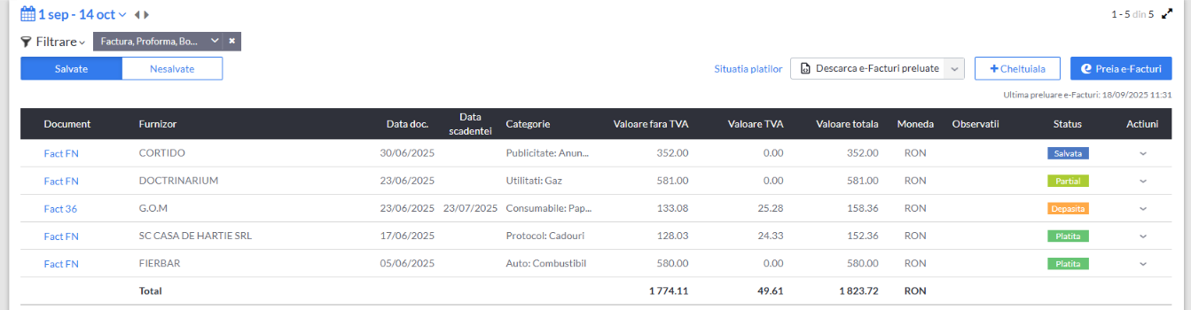 - Actiuni: Vizualizare, Modifica, Plateste, Sterge, Date furnizor si Asociaza cu e-Factura.