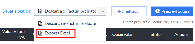 Raportul Cheltuieli poate fi poate fi exportat in format Excel. Pentru asta trebuie sa selectezi actiunea Export Excel de la butonul Descarca e-Facturi preluate.