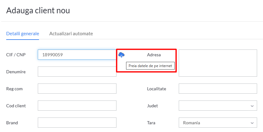 SmartBill a automatizat preluarea informatiilor pentru clientii persoane juridice din Romania. Daca introduci un CIF corect al unei firme din tara, marcajul „nor” din dreptul campului CIF/CNP devine albastru. Norul albastru indica faptul ca a fost identificata o firma care are CIF-ul respectiv, iar daca il apesi, datele acesteia sunt preluate direct de la ANAF.
