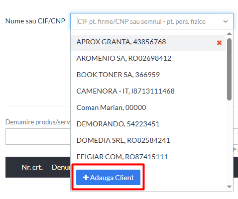 - daca apesi butonul Adauga client aflat in partea de jos a listei afisate in selectorul pentru campul Nume sau CIF/CNP.