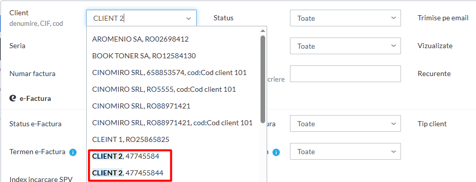 - In raportul documentelor emise (de exemplu, Facturi emise), la filtrul dedicat clientilor, CLIENT 2 apare de doua ori, atat cu CIF-ul vechi, cat si cu cel nou. Indiferent de care dintre cele doua „versiuni" selectezi, se vor afisa toate documentele emise in perioada stabilita, indiferent de CIF. Vei avea facturi emise pe ambele CIF-uri.