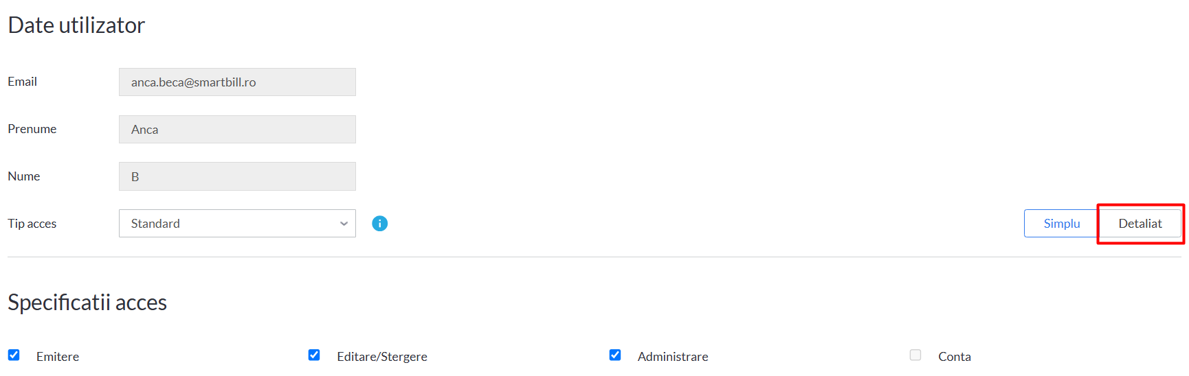 Pentru a putea stabili in mod precis drepturile fiecarui utilizator, in pagina de editare a utilizatorului, apasa butonul Detaliat aflat in partea dreapta, in dreptul datelor utilizatorului.