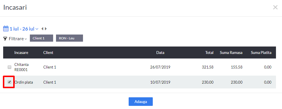- in fereastra care se deschide, sunt afisate incasarile primite de la clientul respectiv. Bifeaza incasarea pe care doresti sa o facturezi;