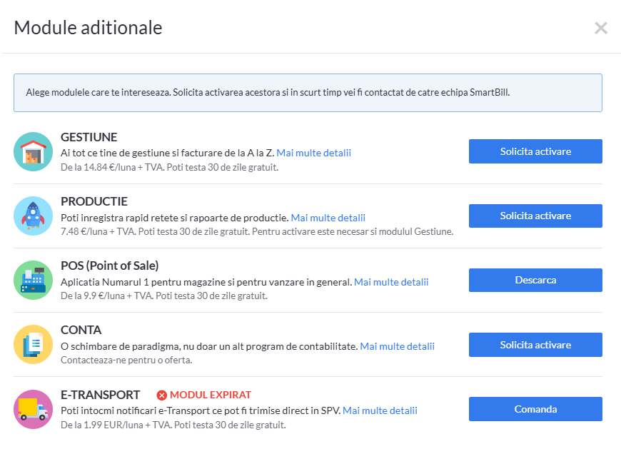 Pentru contul de facturare sunt disponibile: Gestiune, POS, Conta, Productie si e-Transport. Mai multe informatii despre module in Activare module aditionale.