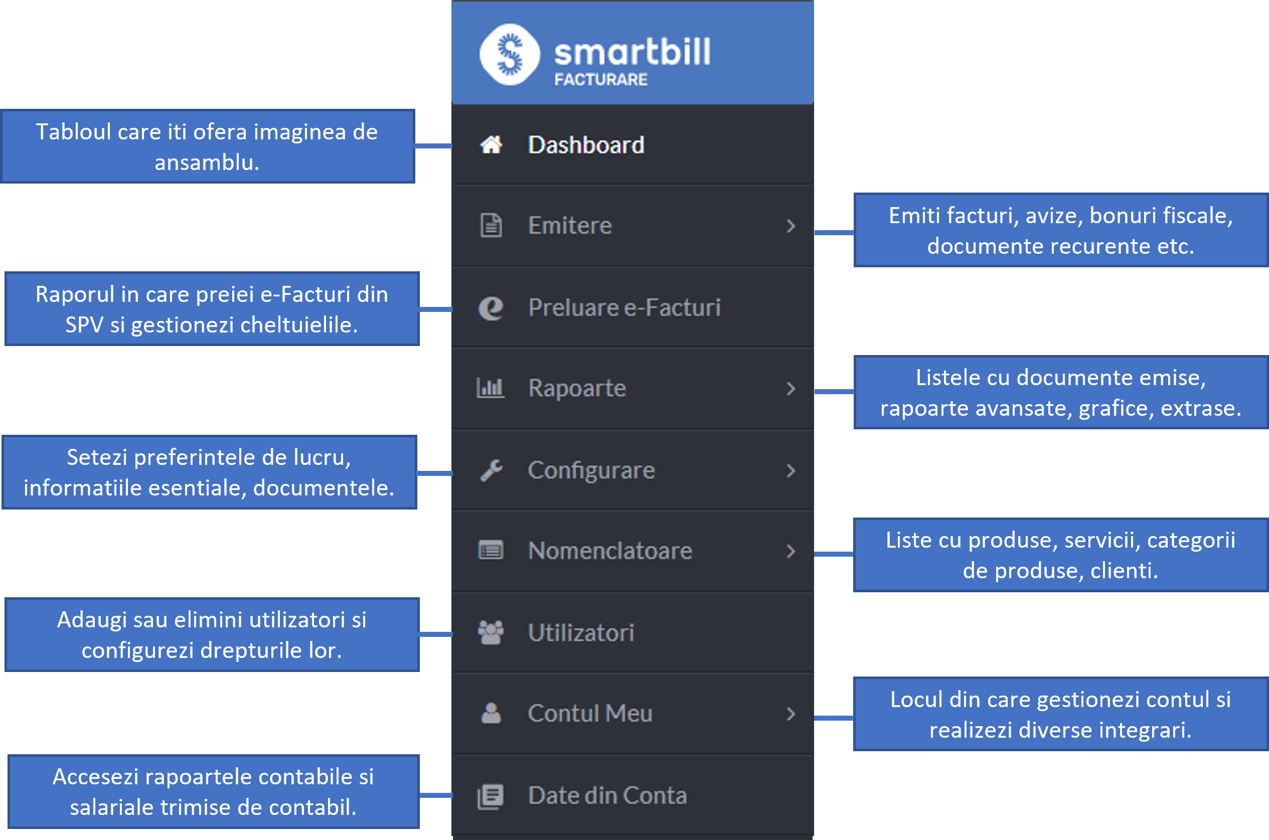 Meniul principal SmartBill se va afla in partea stanga si are urmatoarele sectiuni: