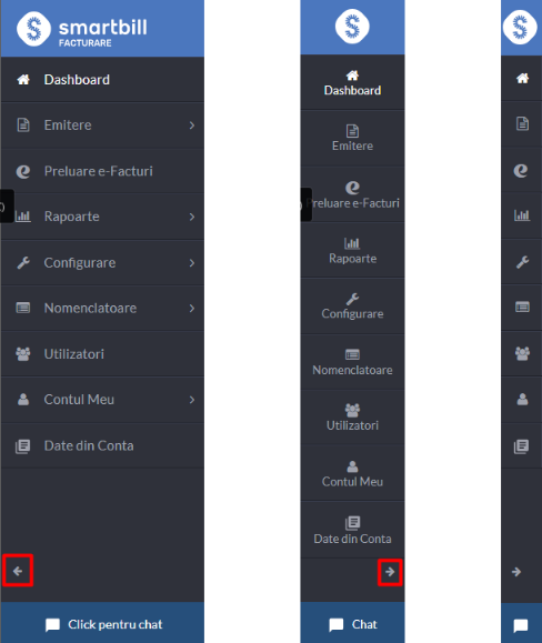 Meniul poate fi afisat intr-o forma extinsa sau restransa (ingusta). Pentru a modifica modul de afisare, apasa sageata din partea de jos a meniului. Modul de afisare depinde si de rezolutia ecranului de pe care accesezi SmartBill.