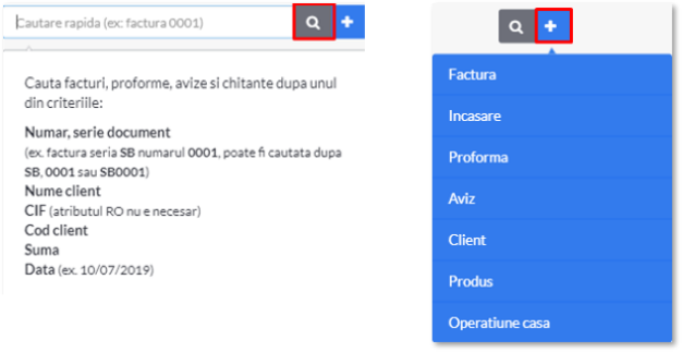 - Cautare rapida (indicat de o lupa): iti permite sa cauti, in functie de diferite criterii, in toate documentele pe care le-ai emis;