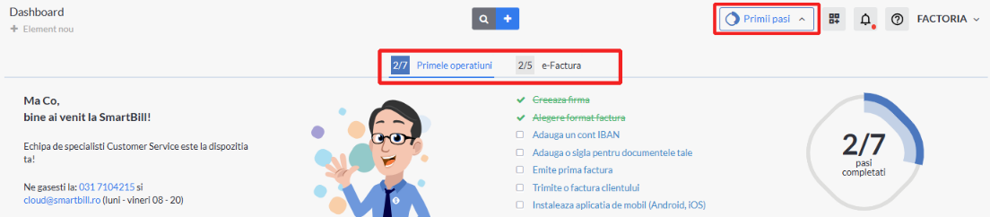Pe masura ce sunt parcursi pasii, acestia sunt „inchisi” si este indicat progresul pe care il ai in invatarea SmartBill.