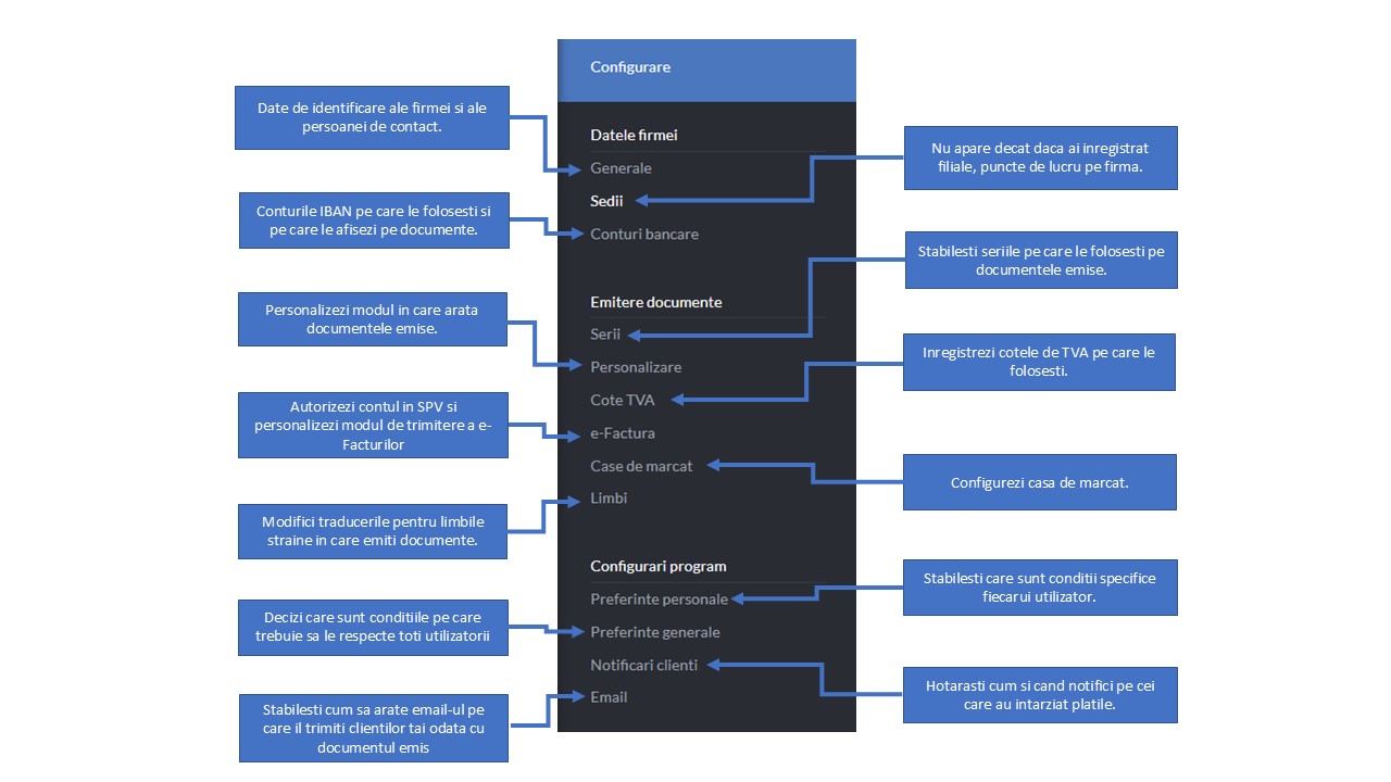 Configurari este o sectiune complexa care acopera multe situatii particulare, specifice doar anumitor tipuri de firme, iar procesul de configurare nu necesita parcurgerea tuturor subsectiunilor. De altfel, pot exista cazuri in care unele pagini de configurare pot lipsi.