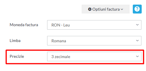Bifeaza daca folosesti calcule (pentru preturi, totaluri) cu mai mult de 2 zecimale: daca bifezi aceasta optiune, in pagina de emitere a facturii/avizului/proformei se afiseaza campul Precizie, care iti permite sa emiti documentele cu valori care au 3 sau 4 zecimale, in functie de alegerea ta. Implicit, documentele se emit din SmartBill cu doua zecimale.