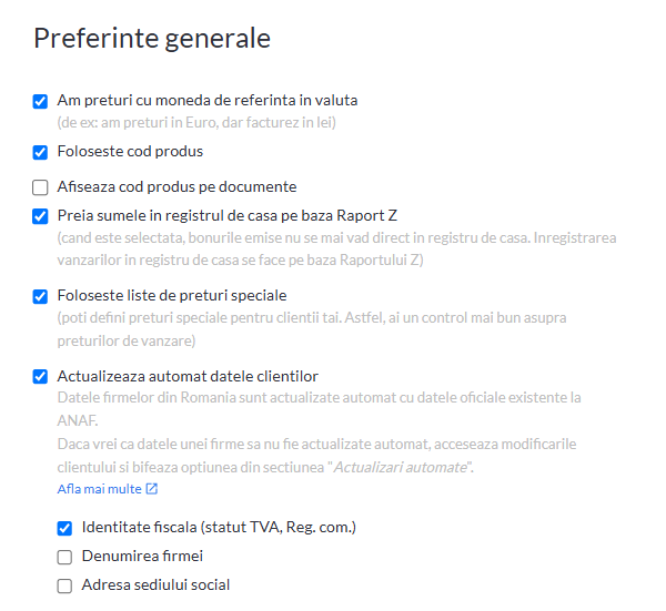 - Actualizeaza automat datele firmelor: cand este bifata, se verifica datele clientilor (ele sunt comparate cu datele inregistrate la ANAF). Atunci cand sunt inexactitati, in aplicatie se vor actualiza informatiile conform celor existente la ANAF. In acest fel, te asiguri ca ai date actualizate si sigure. Poti bifa toate cele trei casute pentru verificarea completa a datelor: