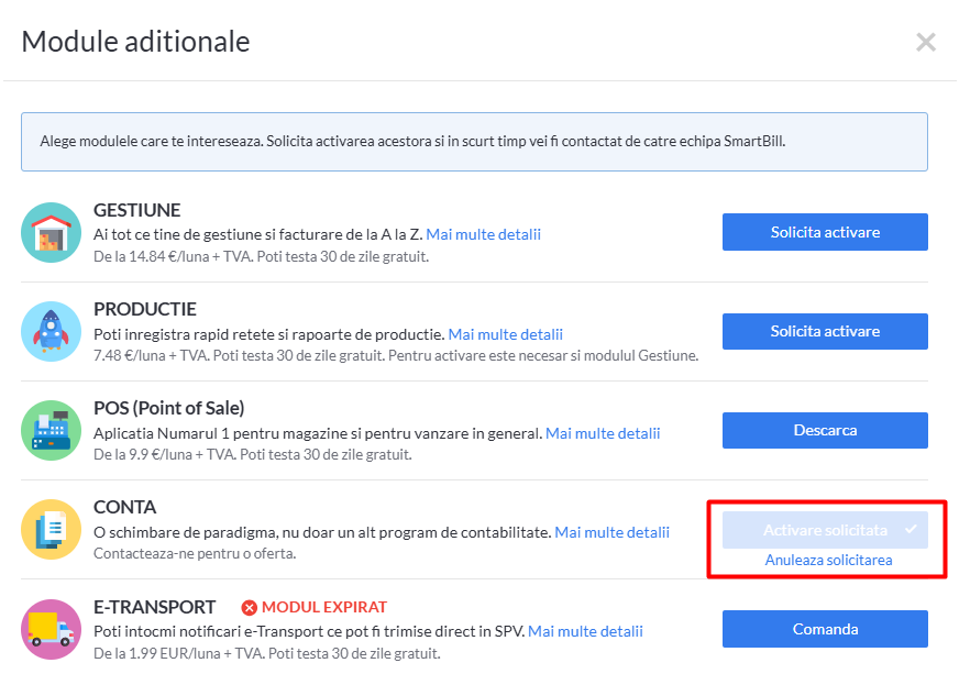 Butonul Module aditionale, aflat in headerul aplicatiei, in coltul din dreapta sus, deschide o fereastra dedicata activarii unor componente ale aplicatiei sau aplicatii SmartBill noi ce pot fi adaugate contului tau existent.