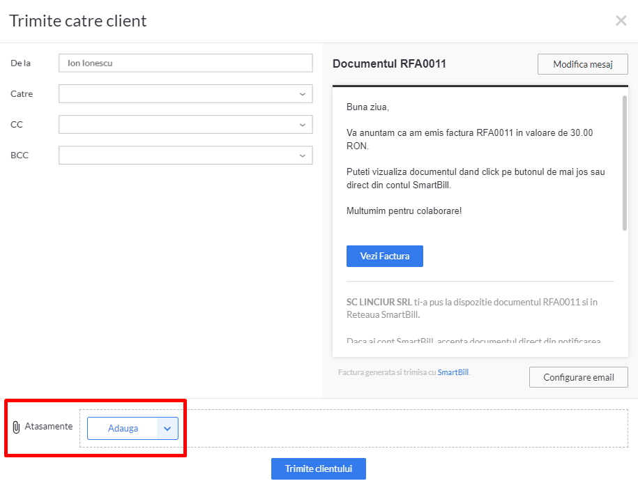 Din fereastra de trimitere a documentelor (factura, aviz, proforma), poti atasa fisiere care sa fie trimise pe email odata cu documentul.