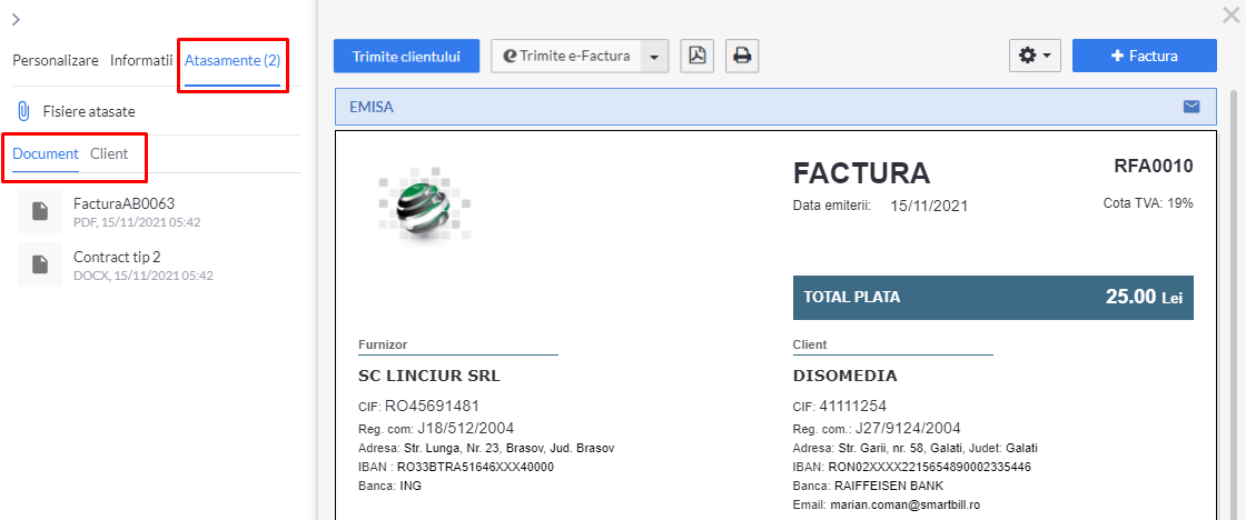 - Factura curenta: lista fisierelor atasate documentului care este trimis (Sunt afisate doar daca documentul a mai fost trimis pe email si a avut atasamente. Nu si fisierele adaugate in operatiunea de trimitere curenta);